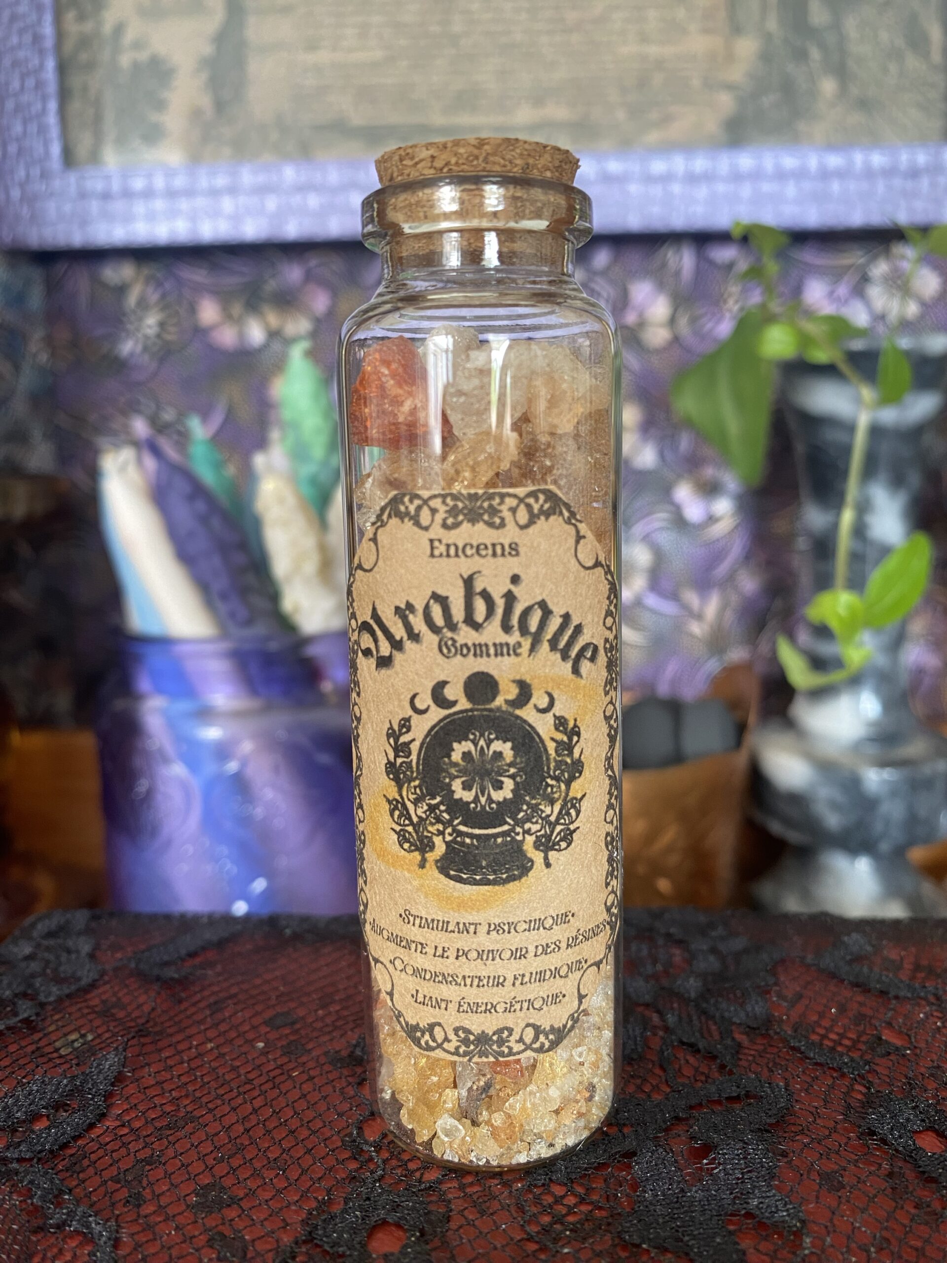 La gomme arabique a souvent été utilisée lors de rites de purification et de protection. Dans certaines cultures africaines, elle était brûlée comme encens pour purifier l’air et repousser les mauvais esprits. Son utilisation dans les rituels était également répandue, en raison de son odeur agréable et de sa capacité à créer une atmosphère sacrée.
