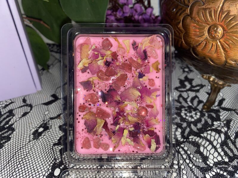 Composition : Alchimie botanique fait main, mélangeant de la cire naturelle de soja, du parfum de Rose mystique, des pétales de Rose, du quartz fraise et des paillettes.